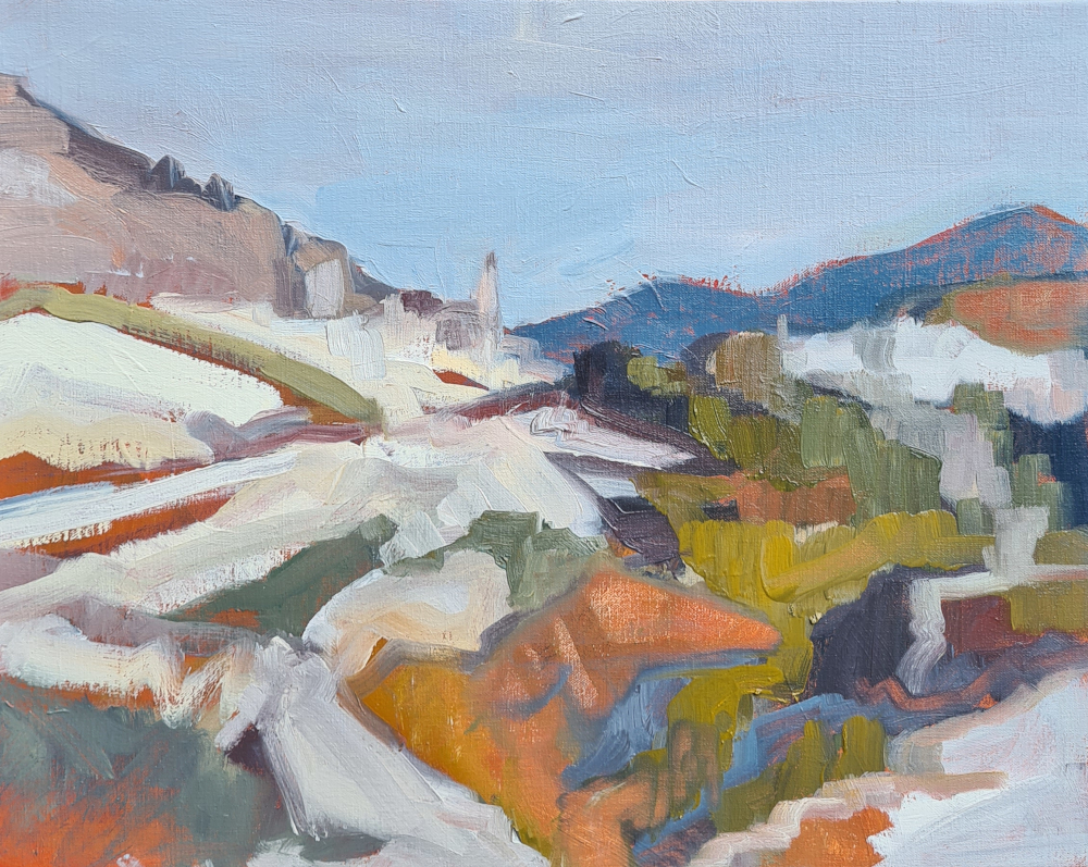 Une vue du village depuis la terrasse. Un chevalet de plein air. Une palette italienne limitée de quatre couleurs. Mais cette fois-ci le village a revêtu son manteau blanc qui perd de sa superbe d’heure en heure alors que la température monte au-dessus de zéro.